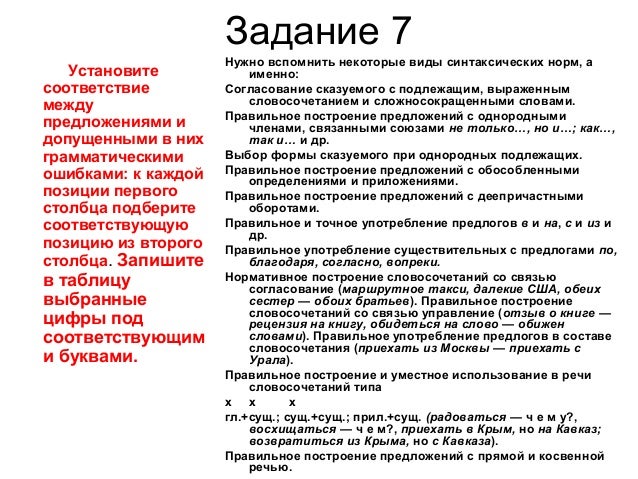 11. Задание 7 Установите соответствие между предложениями и допущенными в них грамматическими ошибками: к каждой позиции первого столбца подберите соответствующую позицию из второго столбца. Запишите в таблицу выбранные цифры под соответствующим и буквами. Нужно вспомнить некоторые виды синтаксических норм, а именно: Согласование сказуемого с подлежащим, выраженным словосочетанием и сложносокращенными словами. Правильное построение предложений с однородными членами, связанными союзами не только…, но и…; как…, так и… и др. Выбор формы сказуемого при однородных подлежащих. Правильное построение предложений с обособленными определениями и приложениями. Правильное построение предложений с деепричастными оборотами. Правильное и точное употребление предлогов в и на, с и из и др. Правильное употребление существительных с предлогами по, благодаря, согласно, вопреки. Нормативное построение словосочетаний со связью согласование (маршрутное такси, далекие США, обеих сестер — обоих братьев). Правильное построение словосочетаний со связью управление (отзыв о книге — рецензия на книгу, обидеться на слово — обижен словами). Правильное употребление предлогов в составе словосочетания (приехать из Москвы — приехать с Урала). Правильное построение и уместное использование в речи словосочетаний типа х х х гл.+сущ.; сущ.+сущ.; прил.+сущ. (радоваться — ч е м у?, восхищаться — ч е м?, приехать в Крым, но на Кавказ; возвратиться из Крыма, но с Кавказа). Правильное построение предложений с прямой и косвенной речью.