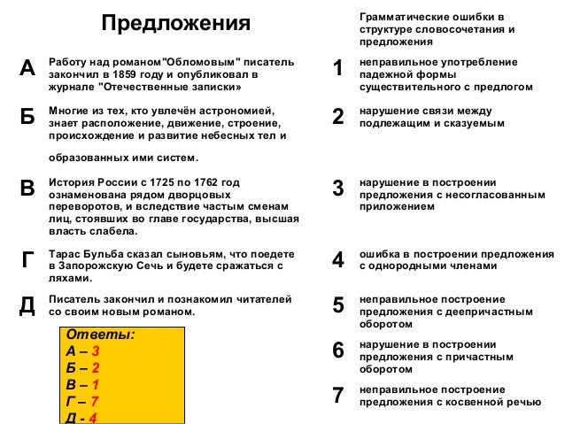 12. Предложения Грамматические ошибки в структуре словосочетания и предложения А Работу над романом"Обломовым" писатель закончил в 1859 году и опубликовал в журнале "Отечественные записки» 1 неправильное употребление падежной формы существительного с предлогом Б Многие из тех, кто увлечён астрономией, знает расположение, движение, строение, происхождение и развитие небесных тел и образованных ими систем. 2 нарушение связи между подлежащим и сказуемым В История России с 1725 по 1762 год ознаменована рядом дворцовых переворотов, и вследствие частым сменам лиц, стоявших во главе государства, высшая власть слабела. 3 нарушение в построении предложения с несогласованным приложением Г Тарас Бульба сказал сыновьям, что поедете в Запорожскую Сечь и будете сражаться с ляхами. 4 ошибка в построении предложения с однородными членами Д Писатель закончил и познакомил читателей со своим новым романом. 5 неправильное построение предложения с деепричастным оборотом 6 нарушение в построении предложения с причастным оборотом 7 неправильное построение предложения с косвенной речью Ответы: А – 3 Б – 2 В – 1 Г – 7 Д - 4