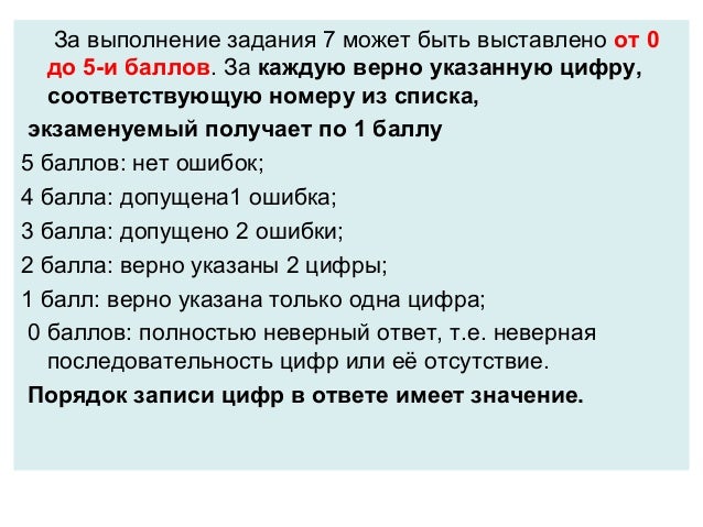 13. За выполнение задания 7 может быть выставлено от 0 до 5-и баллов. За каждую верно указанную цифру, соответствующую номеру из списка, экзаменуемый получает по 1 баллу 5 баллов: нет ошибок; 4 балла: допущена1 ошибка; 3 балла: допущено 2 ошибки; 2 балла: верно указаны 2 цифры; 1 балл: верно указана только одна цифра; 0 баллов: полностью неверный ответ, т.е. неверная последовательность цифр или её отсутствие. Порядок записи цифр в ответе имеет значение.
