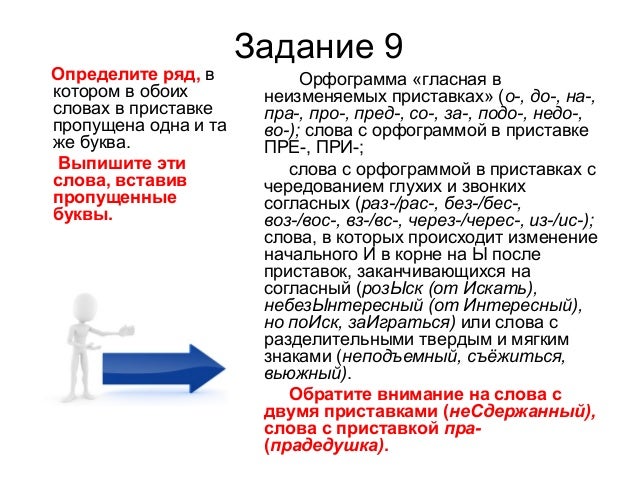 15. Задание 9 Определите ряд, в котором в обоих словах в приставке пропущена одна и та же буква. Выпишите эти слова, вставив пропущенные буквы. Орфограмма «гласная в неизменяемых приставках» (о-, до-, на-, пра-, про-, пред-, со-, за-, подо-, недо-, во-); слова с орфограммой в приставке ПРЕ-, ПРИ-; слова с орфограммой в приставках с чередованием глухих и звонких согласных (раз-/рас-, без-/бес-, воз-/вос-, вз-/вс-, через-/черес-, из-/ис-); слова, в которых происходит изменение начального И в корне на Ы после приставок, заканчивающихся на согласный (розЫск (от Искать), небезЫнтересный (от Интересный), но поИск, заИграться) или слова с разделительными твердым и мягким знаками (неподъемный, съёжиться, вьюжный). Обратите внимание на слова с двумя приставками (неСдержанный), слова с приставкой пра- (прадедушка).