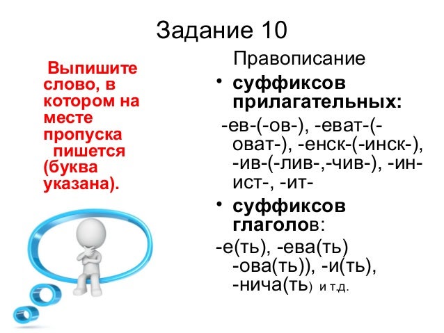 16. Задание 10 Выпишите слово, в котором на месте пропуска пишется (буква указана). Правописание • суффиксов прилагательных: -ев-(-ов-), -еват-(- оват-), -енск-(-инск-), -ив-(-лив-,-чив-), -ин- ист-, -ит- • суффиксов глаголов: -е(ть), -ева(ть) -ова(ть)), -и(ть), -нича(ть) и т.д.