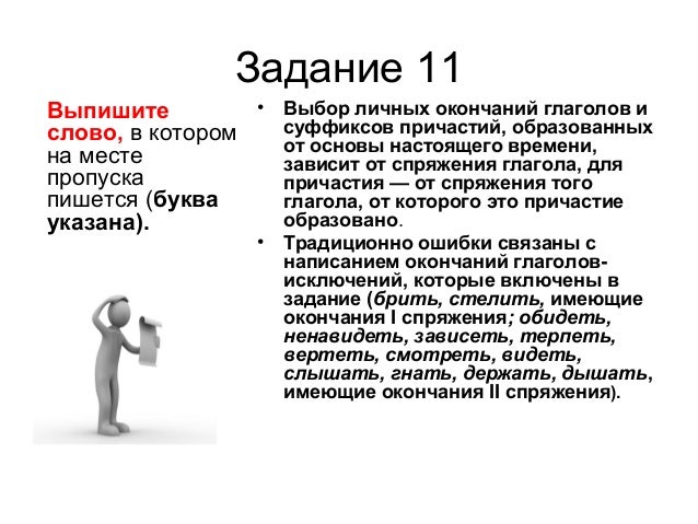 17. Задание 11 Выпишите слово, в котором на месте пропуска пишется (буква указана). • Выбор личных окончаний глаголов и суффиксов причастий, образованных от основы настоящего времени, зависит от спряжения глагола, для причастия — от спряжения того глагола, от которого это причастие образовано. • Традиционно ошибки связаны с написанием окончаний глаголов- исключений, которые включены в задание (брить, стелить, имеющие окончания I спряжения; обидеть, ненавидеть, зависеть, терпеть, вертеть, смотреть, видеть, слышать, гнать, держать, дышать, имеющие окончания II спряжения).