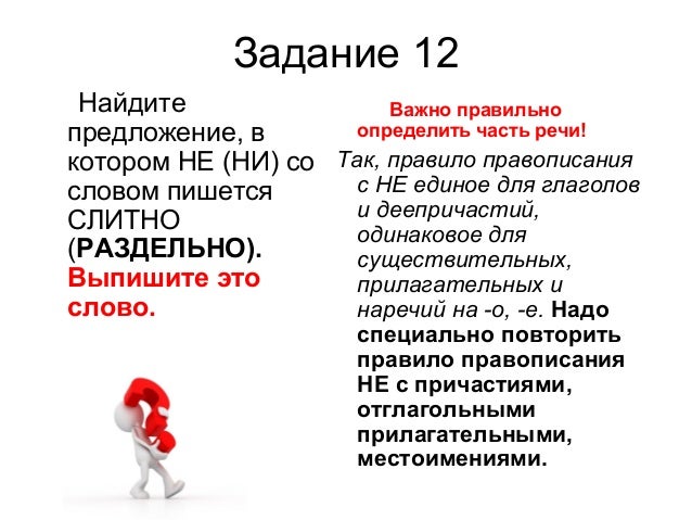 18. Задание 12 Найдите предложение, в котором НЕ (НИ) со словом пишется СЛИТНО (РАЗДЕЛЬНО). Выпишите это слово. Важно правильно определить часть речи! Так, правило правописания с НЕ единое для глаголов и деепричастий, одинаковое для существительных, прилагательных и наречий на -о, -е. Надо специально повторить правило правописания НЕ с причастиями, отглагольными прилагательными, местоимениями.