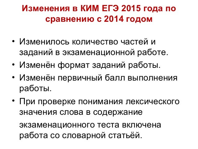 1. Изменения в КИМ ЕГЭ 2015 года по сравнению с 2014 годом • Изменилось количество частей и заданий в экзаменационной работе. • Изменён формат заданий работы. • Изменён первичный балл выполнения работы. • При проверке понимания лексического значения слова в содержание экзаменационного теста включена работа со словарной статьёй.