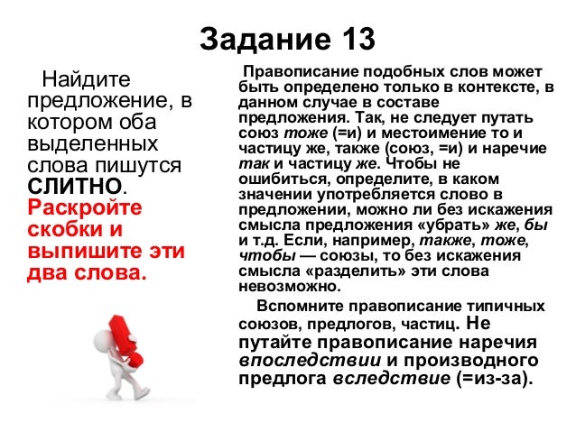 19. Задание 13 Найдите предложение, в котором оба выделенных слова пишутся СЛИТНО. Раскройте скобки и выпишите эти два слова. Правописание подобных слов может быть определено только в контексте, в данном случае в составе предложения. Так, не следует путать союз тоже (=и) и местоимение то и частицу же, также (союз, =и) и наречие так и частицу же. Чтобы не ошибиться, определите, в каком значении употребляется слово в предложении, можно ли без искажения смысла предложения «убрать» же, бы и т.д. Если, например, также, тоже, чтобы — союзы, то без искажения смысла «разделить» эти слова невозможно. Вспомните правописание типичных союзов, предлогов, частиц. Не путайте правописание наречия впоследствии и производного предлога вследствие (=из-за).