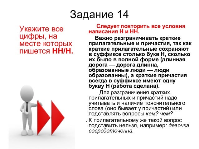 20. Задание 14 Укажите все цифры, на месте которых пишется НН/Н. Следует повторить все условия написания Н и НН. Важно разграничивать краткие прилагательные и причастия, так как краткие прилагательные сохраняют в суффиксе столько букв Н, сколько их было в полной форме (длинная дорога — дорога длинна, образованные люди — люди образованны), а краткие причастия всегда в суффиксе имеют одну букву Н (работа сделана). Для разграничения кратких прилагательных и причастий надо учитывать и наличие пояснительного слова (оно бывает у причастий) или подставлять вопросы кем? чем? . К прилагательному же такой вопрос подставить нельзя, например: девочка сосредоточенна.