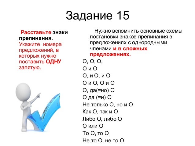21. Задание 15 Расставьте знаки препинания. Укажите номера предложений, в которых нужно поставить ОДНУ запятую. Нужно вспомнить основные схемы постановки знаков препинания в предложениях с однородными членами и в сложных предложениях. O, O, O, O и O O, и O, и O O и O, O и O O, да(=но) O O да (=и) O Не только O, но и O Как O, так и O Либо O, либо O O или O То O, то O Не то O, не то O