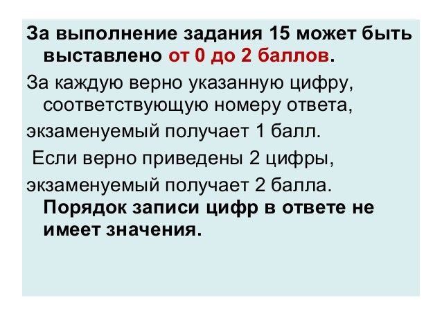 22. За выполнение задания 15 может быть выставлено от 0 до 2 баллов. За каждую верно указанную цифру, соответствующую номеру ответа, экзаменуемый получает 1 балл. Если верно приведены 2 цифры, экзаменуемый получает 2 балла. Порядок записи цифр в ответе не имеет значения.