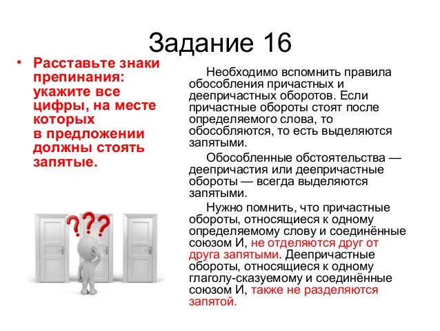 23. Задание 16 • Расставьте знаки препинания: укажите все цифры, на месте которых в предложении должны стоять запятые. Необходимо вспомнить правила обособления причастных и деепричастных оборотов. Если причастные обороты стоят после определяемого слова, то обособляются, то есть выделяются запятыми. Обособленные обстоятельства — деепричастия или деепричастные обороты — всегда выделяются запятыми. Нужно помнить, что причастные обороты, относящиеся к одному определяемому слову и соединённые союзом И, не отделяются друг от друга запятыми. Деепричастные обороты, относящиеся к одному глаголу-сказуемому и соединённые союзом И, также не разделяются запятой.