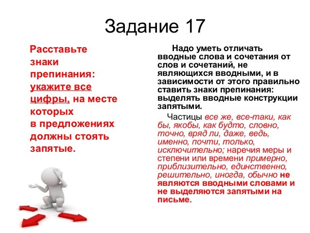 24. Задание 17 Расставьте знаки препинания: укажите все цифры, на месте которых в предложениях должны стоять запятые. Надо уметь отличать вводные слова и сочетания от слов и сочетаний, не являющихся вводными, и в зависимости от этого правильно ставить знаки препинания: выделять вводные конструкции запятыми. Частицы все же, все-таки, как бы, якобы, как будто, словно, точно, вряд ли, даже, ведь, именно, почти, только, исключительно; наречия меры и степени или времени примерно, приблизительно, единственно, решительно, иногда, обычно не являются вводными словами и не выделяются запятыми на письме.