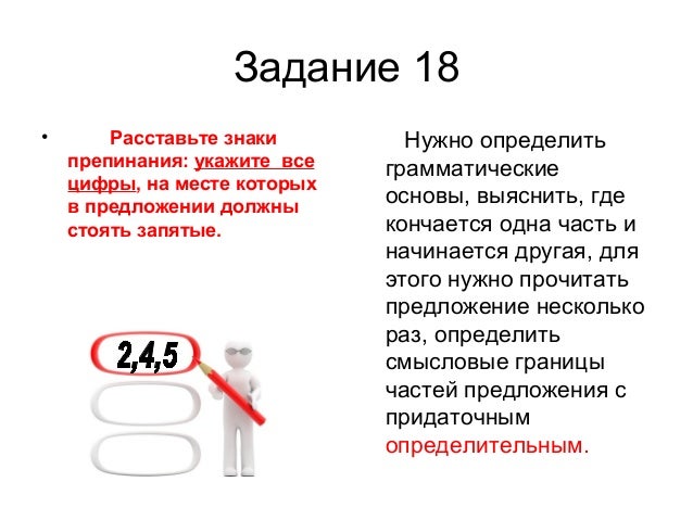 25. Задание 18 • Расставьте знаки препинания: укажите все цифры, на месте которых в предложении должны стоять запятые. Нужно определить грамматические основы, выяснить, где кончается одна часть и начинается другая, для этого нужно прочитать предложение несколько раз, определить смысловые границы частей предложения с придаточным определительным.