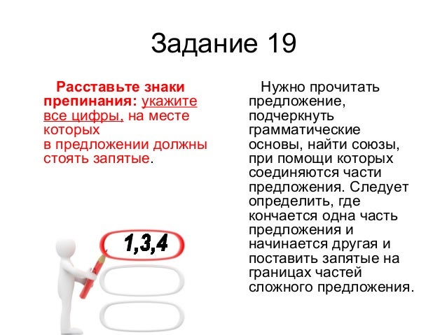 26. Задание 19 Расставьте знаки препинания: укажите все цифры, на месте которых в предложении должны стоять запятые. Нужно прочитать предложение, подчеркнуть грамматические основы, найти союзы, при помощи которых соединяются части предложения. Следует определить, где кончается одна часть предложения и начинается другая и поставить запятые на границах частей сложного предложения.