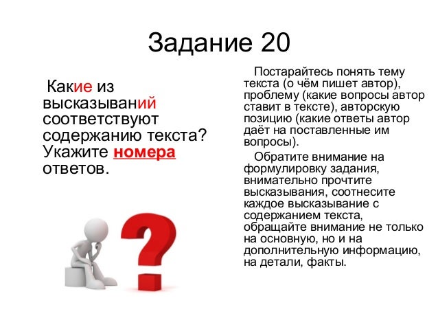 27. Задание 20 Какие из высказываний соответствуют содержанию текста? Укажите номера ответов. Постарайтесь понять тему текста (о чём пишет автор), проблему (какие вопросы автор ставит в тексте), авторскую позицию (какие ответы автор даёт на поставленные им вопросы). Обратите внимание на формулировку задания, внимательно прочтите высказывания, соотнесите каждое высказывание с содержанием текста, обращайте внимание не только на основную, но и на дополнительную информацию, на детали, факты.