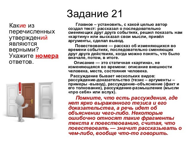 28. Задание 21 Какие из перечисленных утверждений являются верными? Укажите номера ответов. Главное – установить, с какой целью автор создал текст: рассказал о последовательно сменяющих друг друга событиях, решил показать нам «картину» или высказал свои мысли, привёл аргументы, сделал вывод. Повествование — рассказ об изменяющихся во времени событиях, последовательно сменяющих друг друга действиях, когда можно понять, что было вначале, потом, в итоге. Описание — это статичная «картина», не изменяющаяся во времени: описание внешности человека, места, состояния человека. Рассуждение бывает нескольких видов: рассуждение-доказательство (тезис – аргументы – примеры -вывод), рассуждение–объяснение (факт и его толкование), рассуждение-размышление (мысли «про себя» или вслух). Помните, что есть рассуждения, где нет ярко выраженного тезиса и его доказательства, а речь идет об объяснении чего-либо. Некоторые ошибочно относят такие фрагменты текста к повествованию, считая, что повествовать — значит рассказывать о чем-либо, вообще что-то говорить.