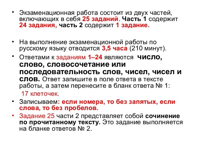 2. • Экзаменационная работа состоит из двух частей, включающих в себя 25 заданий. Часть 1 содержит 24 задания, часть 2 содержит 1 задание. • На выполнение экзаменационной работы по русскому языку отводится 3,5 часа (210 минут). • Ответами к заданиям 1–24 являются число, слово, словосочетание или последовательность слов, чисел, чисел и слов. Ответ запишите в поле ответа в тексте работы, а затем перенесите в бланк ответа № 1: 17 клеточек. • Записываем: если номера, то без запятых, если слова, то без пробелов. • Задание 25 части 2 представляет собой сочинение по прочитанному тексту. Это задание выполняется на бланке ответов № 2.