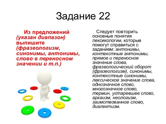 29. Задание 22 Из предложений (указан диапазон) выпишите (фразеологизм, синонимы, антонимы, слово в переносном значении и т.п.) Следует повторить основные понятия лексикологии, которые помогут справиться с заданием: антонимы, контекстные антонимы, прямое и переносное значение слова, фразеологический оборот (фразеологизм), синонимы, контекстные синонимы, лексическое значение слова, однозначное слово, многозначное слово, термин, устаревшее слово, архаизм, неологизм, заимствованное слово, диалектизм.