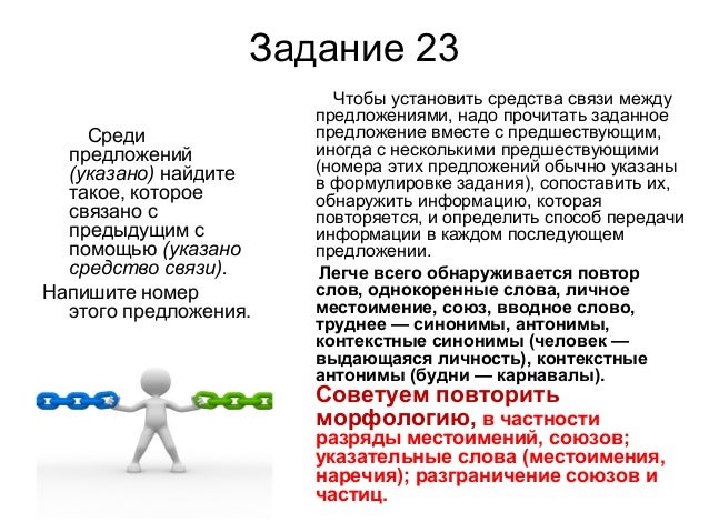 30. Задание 23 Среди предложений (указано) найдите такое, которое связано с предыдущим с помощью (указано средство связи). Напишите номер этого предложения. Чтобы установить средства связи между предложениями, надо прочитать заданное предложение вместе с предшествующим, иногда с несколькими предшествующими (номера этих предложений обычно указаны в формулировке задания), сопоставить их, обнаружить информацию, которая повторяется, и определить способ передачи информации в каждом последующем предложении. Легче всего обнаруживается повтор слов, однокоренные слова, личное местоимение, союз, вводное слово, труднее — синонимы, антонимы, контекстные синонимы (человек — выдающаяся личность), контекстные антонимы (будни — карнавалы). Советуем повторить морфологию, в частности разряды местоимений, союзов; указательные слова (местоимения, наречия); разграничение союзов и частиц.