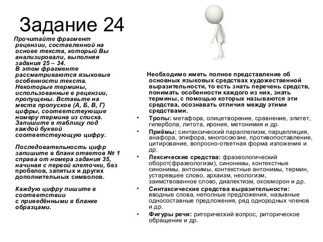 31. Задание 24 Прочитайте фрагмент рецензии, составленной на основе текста, который Вы анализировали, выполняя задания 25 – 34. В этом фрагменте рассматриваются языковые особенности текста. Некоторые термины, использованные в рецензии, пропущены. Вставьте на места пропусков (А, Б, В, Г) цифры, соответствующие номеру термина из списка. Запишите в таблицу под каждой буквой соответствующую цифру. Последовательность цифр запишите в бланк ответов № 1 справа от номера задания 35, начиная с первой клеточки, без пробелов, запятых и других дополнительных символов. Каждую цифру пишите в соответствии с приведёнными в бланке образцами. Необходимо иметь полное представление об основных языковых средствах художественной выразительности, то есть знать перечень средств, понимать особенности каждого из них, знать термины, с помощью которых называются эти средства, осознавать отличия между этими средствами. • Тропы: метафора, олицетворение, сравнение, эпитет, гипербола, литота, ирония, метонимия и др. • Приёмы: синтаксический параллелизм, парцелляция, анафора, эпифора, многосоюзие, противопоставление, цитирование, вопросно-ответная форма изложения и др. • Лексические средства: фразеологический оборот(фразеологизм), синонимы, контекстные синонимы, антонимы, контекстные антонимы, термин, устаревшее слово, архаизм, неологизм, заимствованное слово, диалектизм, оксюморон и др. • Синтаксические средства выразительности: вводные слова, неполные предложения, назывные односоставные предложения, ряд однородных членов и др. • Фигуры речи: риторический вопрос, риторическое обращение и др.