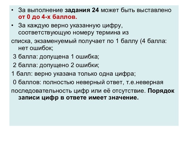 32. • За выполнение задания 24 может быть выставлено от 0 до 4-х баллов. • За каждую верно указанную цифру, соответствующую номеру термина из списка, экзаменуемый получает по 1 баллу (4 балла: нет ошибок; 3 балла: допущена 1 ошибка; 2 балла: допущено 2 ошибки; 1 балл: верно указана только одна цифра; 0 баллов: полностью неверный ответ, т.е.неверная последовательность цифр или её отсутствие. Порядок записи цифр в ответе имеет значение.