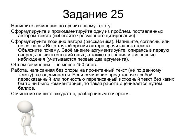 33. Задание 25 Напишите сочинение по прочитанному тексту. Сформулируйте и прокомментируйте одну из проблем, поставленных автором текста (избегайте чрезмерного цитирования). Сформулируйте позицию автора (рассказчика). Напишите, согласны или не согласны Вы с точкой зрения автора прочитанного текста. Объясните почему. Своё мнение аргументируйте, опираясь в первую очередь на читательский опыт, а также на знания и жизненные наблюдения (учитываются первые два аргумента). Объём сочинения – не менее 150 слов. Работа, написанная без опоры на прочитанный текст (не по данному тексту), не оценивается. Если сочинение представляет собой пересказанный или полностью переписанный исходный текст без каких бы то ни было комментариев, то такая работа оценивается нулём баллов. Сочинение пишите аккуратно, разборчивым почерком.