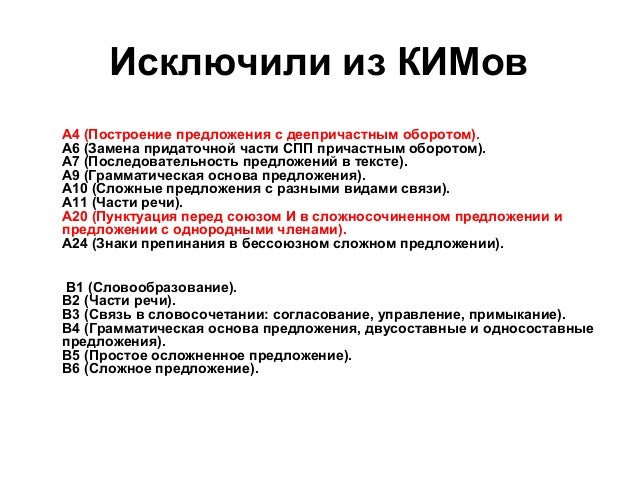 3. Исключили из КИМов А4 (Построение предложения с деепричастным оборотом). А6 (Замена придаточной части СПП причастным оборотом). А7 (Последовательность предложений в тексте). А9 (Грамматическая основа предложения). А10 (Сложные предложения с разными видами связи). А11 (Части речи). А20 (Пунктуация перед союзом И в сложносочиненном предложении и предложении с однородными членами). А24 (Знаки препинания в бессоюзном сложном предложении). В1 (Словообразование). В2 (Части речи). В3 (Связь в словосочетании: согласование, управление, примыкание). В4 (Грамматическая основа предложения, двусоставные и односоставные предложения). В5 (Простое осложненное предложение). В6 (Сложное предложение).