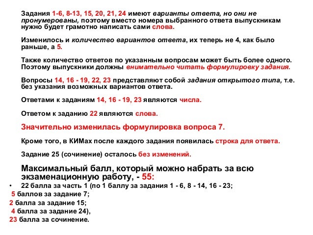 4. Задания 1-6, 8-13, 15, 20, 21, 24 имеют варианты ответа, но они не пронумерованы, поэтому вместо номера выбранного ответа выпускникам нужно будет грамотно написать сами слова. Изменилось и количество вариантов ответа, их теперь не 4, как было раньше, а 5. Также количество ответов по указанным вопросам может быть более одного. Поэтому выпускники должны внимательно читать формулировку задания. Вопросы 14, 16 - 19, 22, 23 представляют собой задания открытого типа, т.е. без указания возможных вариантов ответа. Ответами к заданиям 14, 16 - 19, 23 являются числа. Ответом к заданию 22 являются слова. Значительно изменилась формулировка вопроса 7. Кроме того, в КИМах после каждого задания появилась строка для ответа. Задание 25 (сочинение) осталось без изменений. Максимальный балл, который можно набрать за всю экзаменационную работу, - 55: • 22 балла за часть 1 (по 1 баллу за задания 1 - 6, 8 - 14, 16 - 23; 5 баллов за задание 7; 2 балла за задание 15; 4 балла за задание 24), 23 балла за сочинение.