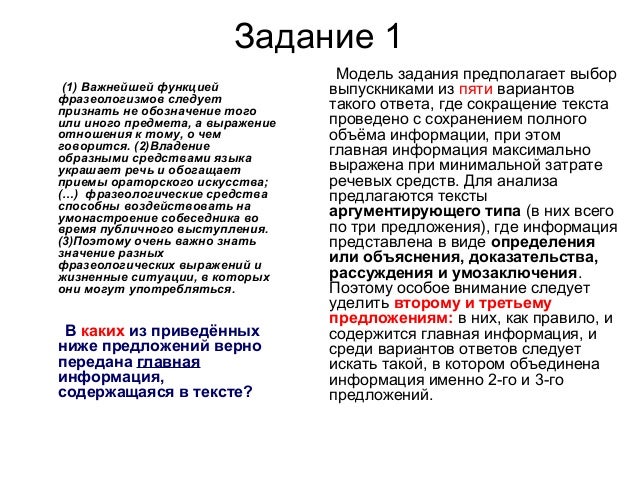 5. Задание 1 Модель задания предполагает выбор выпускниками из пяти вариантов такого ответа, где сокращение текста проведено с сохранением полного объёма информации, при этом главная информация максимально выражена при минимальной затрате речевых средств. Для анализа предлагаются тексты аргументирующего типа (в них всего по три предложения), где информация представлена в виде определения или объяснения, доказательства, рассуждения и умозаключения. Поэтому особое внимание следует уделить второму и третьему предложениям: в них, как правило, и содержится главная информация, и среди вариантов ответов следует искать такой, в котором объединена информация именно 2-го и 3-го предложений. (1) Важнейшей функцией фразеологизмов следует признать не обозначение того или иного предмета, а выражение отношения к тому, о чем говорится. (2)Владение образными средствами языка украшает речь и обогащает приемы ораторского искусства; (…) фразеологические средства способны воздействовать на умонастроение собеседника во время публичного выступления. (3)Поэтому очень важно знать значение разных фразеологических выражений и жизненные ситуации, в которых они могут употребляться. В каких из приведённых ниже предложений верно передана главная информация, содержащаяся в тексте?