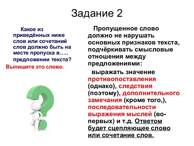 6. Задание 2 Какое из приведённых ниже слов или сочетаний слов должно быть на месте пропуска в….. предложении текста? Выпишите это слово. Пропущенное слово должно не нарушать основных признаков текста, подчёркивать смысловые отношения между предложениями: выражать значение противопоставления (однако), следствия (поэтому), дополнительного замечания (кроме того,), последовательности выражения мыслей (во- первых) и т.д. Ответом будет сцепляющее слово или сочетание слов.