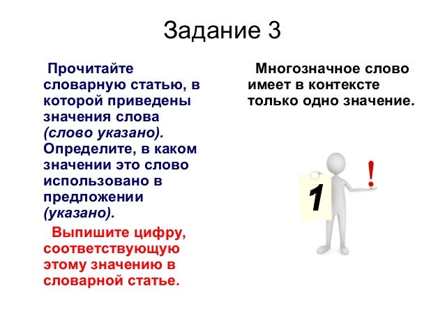 7. Задание 3 Прочитайте словарную статью, в которой приведены значения слова (слово указано). Определите, в каком значении это слово использовано в предложении (указано). Выпишите цифру, соответствующую этому значению в словарной статье. Многозначное слово имеет в контексте только одно значение.