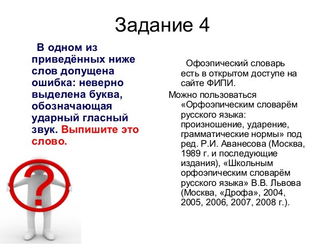 8. Задание 4 В одном из приведённых ниже слов допущена ошибка: неверно выделена буква, обозначающая ударный гласный звук. Выпишите это слово. Офоэпический словарь есть в открытом доступе на сайте ФИПИ. Можно пользоваться «Орфоэпическим словарём русского языка: произношение, ударение, грамматические нормы» под ред. Р.И. Аванесова (Москва, 1989 г. и последующие издания), «Школьным орфоэпическим словарём русского языка» В.В. Львова (Москва, «Дрофа», 2004, 2005, 2006, 2007, 2008 г.).