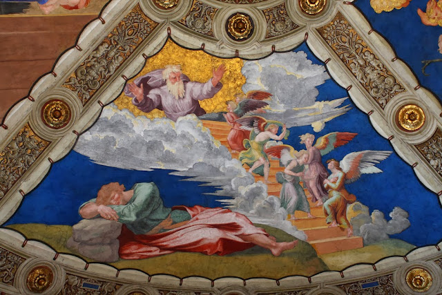 Фреска "Встреча Святого Льва I Великого с Аттилой"(1514 г.),иллюстрирует особую заботу Создателя о Риме.Слева изображен папский кортеж,возглавляемый Папой Львом I Великим(440-461 гг.н.э.) на белом коне,который,согласно легенде,остановил продвижение войск короля гуннов Аттилы.На самом деле этот эпизод имел место на севере Италии,но фантазия художника переносит действие к воротам Рима,так как именно Рим считался сердцем христианства.
