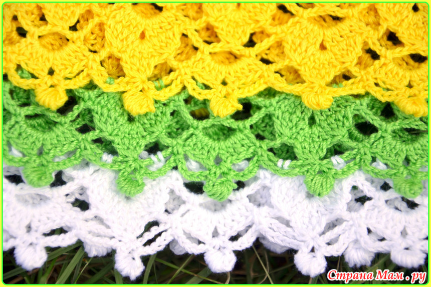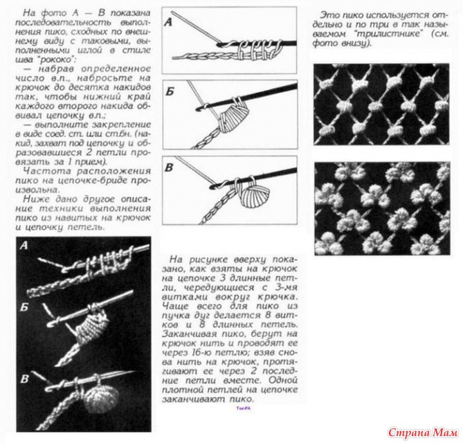 Вместо арок-пико в последнем ряду обвязки делала витой узелок. Вот пояснение к витому узелку