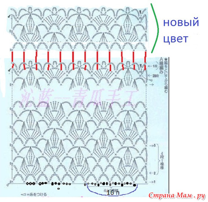 Схема основного полотна. На схеме показала, как крепить новые цвета и с какого ряда начать новый цвет.