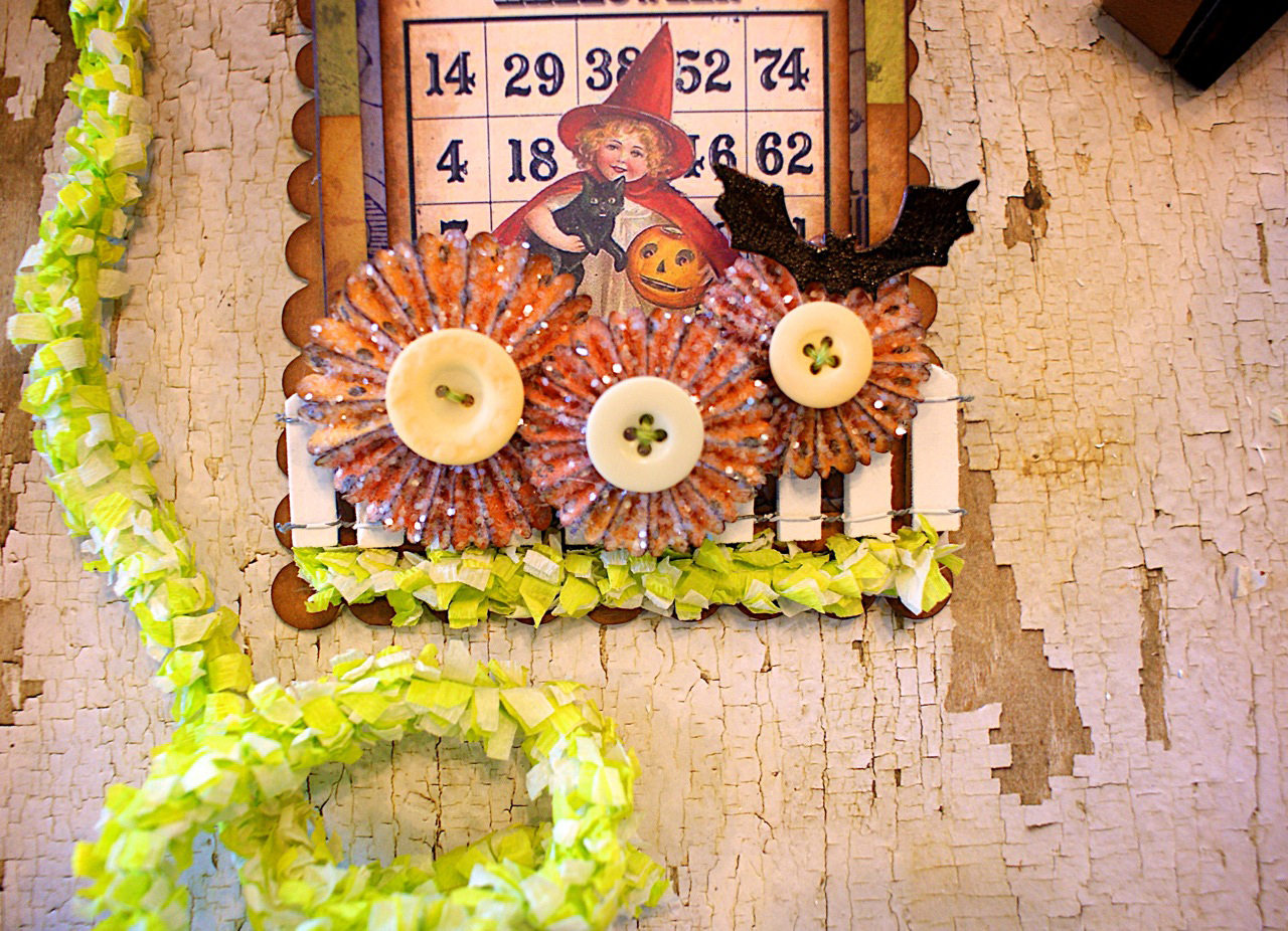 Придерживайтесь вашей "тыква" розетки к забору помощью горячего клея, а сверху нити связали кнопку. Тогда под деревянным забором, я придерживался немного бахромой ручной работы гофрированной бумаги для веселья винтажный вид.