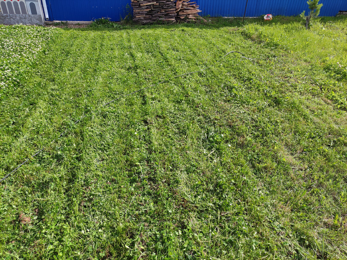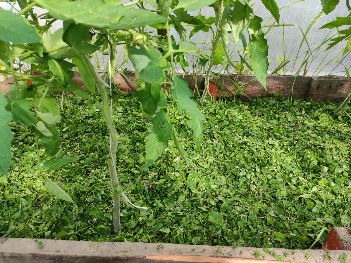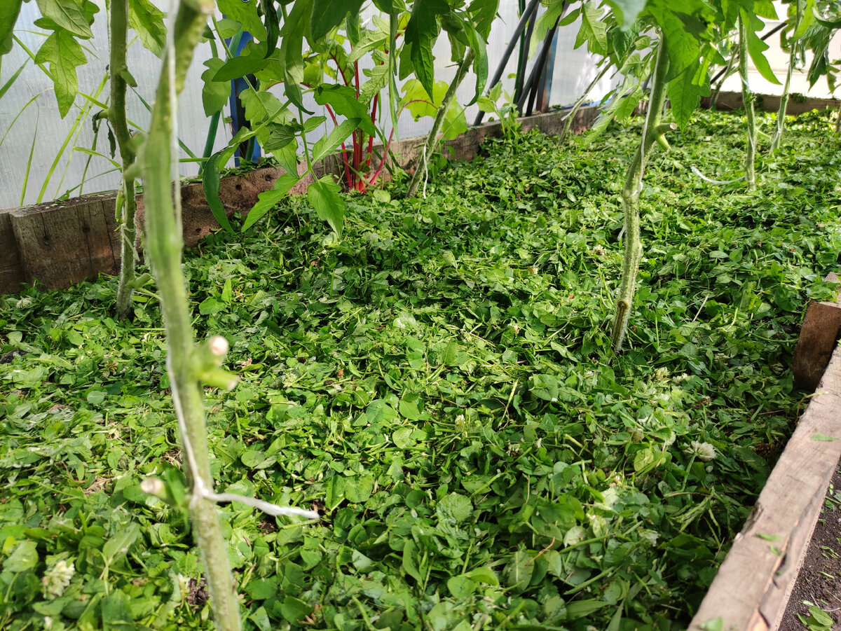 Тем более перед мастерской у меня посажен микроклевер, газонокосилка умеет делать мульчу, с меня остаётся только накосить, и разложить скошенный клевер толстым - толстым слоем на грядки с помидорами.