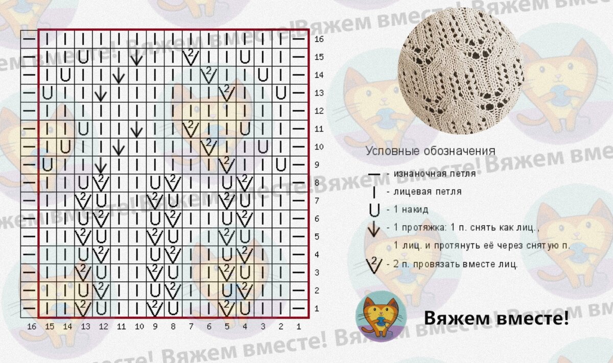 Раппорт узора равен 15 петлям по ширине и 16 рядам по высоте. Рисунок вяжется с формированием узора в каждом ряду раппорта.