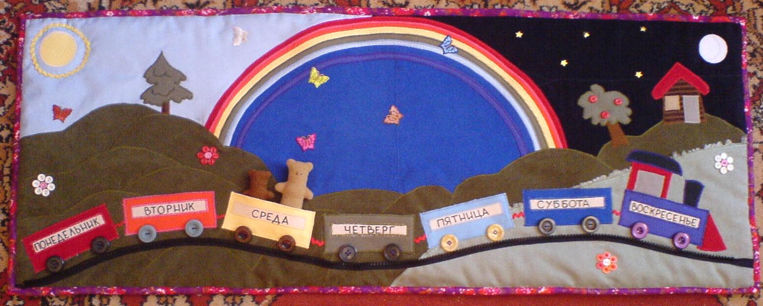 Благодаря коврику мы можем изучать не только дни недели, но и понятия "сегодня", "вчера", "завтра"; цвета (7); понятия "утро", "вечер" и "ночь"; счет до 14; формы круга, квадрата, прямоугольника, полукруга и много чего еще.