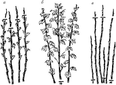 Обрезка малины: а — весеннее укорачивание стеблей до живой почки,б — вырезка отплодоносивших стеблей, в — удаление лишних побегов осенью или весной, укорачивание побегов на высоте 1,5–1,8 м