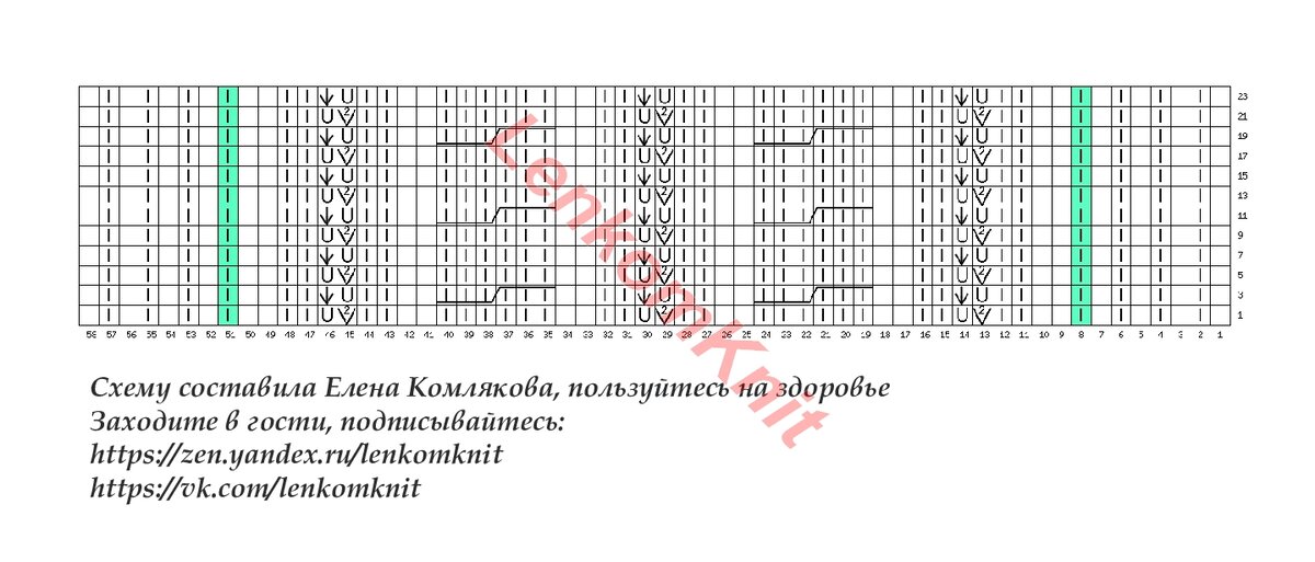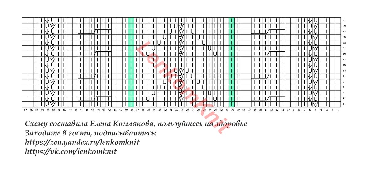 Это - схема спинки. Здесь тоже идут прибавления в каждом десятом ряду справа и слева от петель, отмеченных зеленым. Они включаются в простой ажурный узорчик (накид, две петли вместе лицевой)