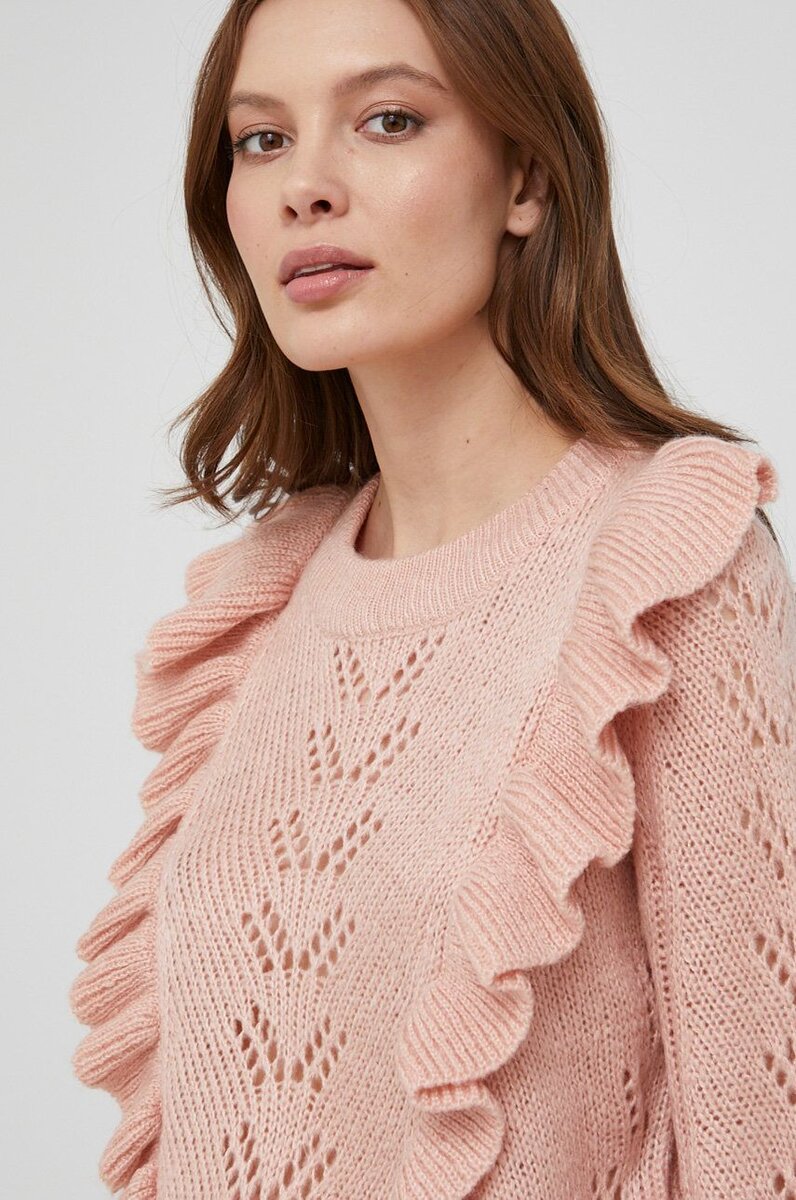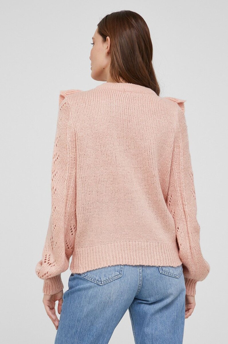 Узор в свитере идет только по переду (как и рюши), а спинка модели связана обычной лицевой гладью.