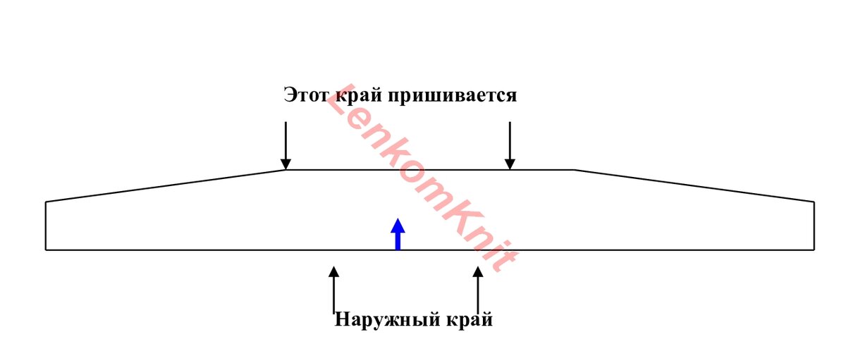 Это - выкройка рюши (вторая вяжется в зеркальном отражении). Вяжутся рюши укороченными рядами (направление вязания - синяя стрелка). Получается, что по краям деталь более узкая, а в центре - широкая.