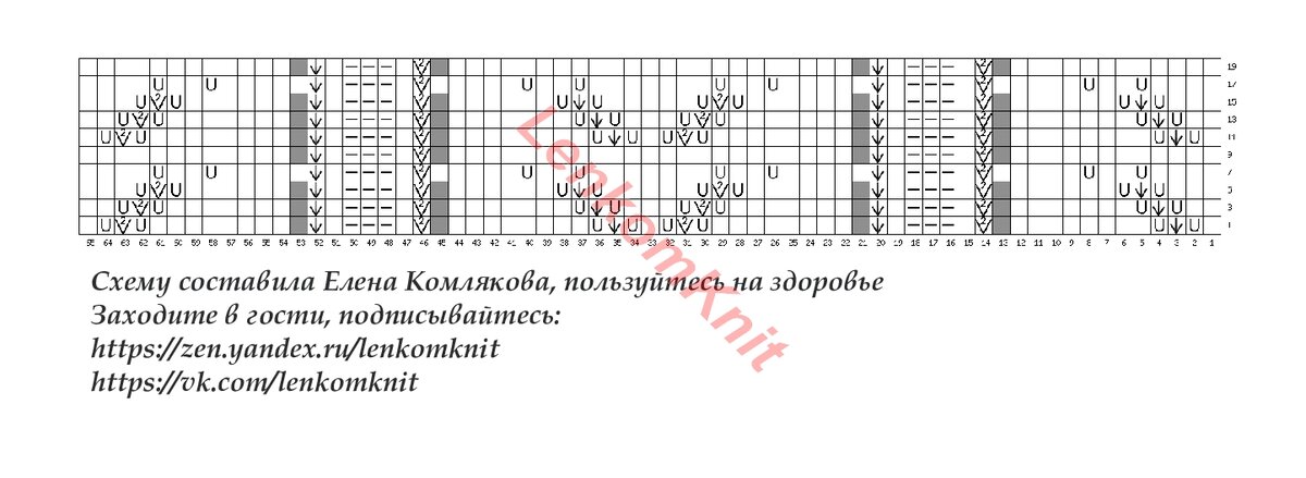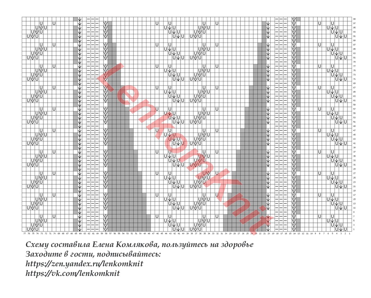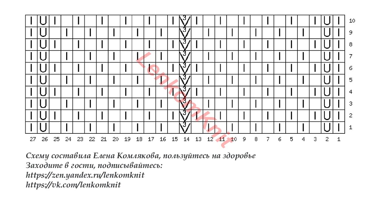 Это - схема рюшей. В ширину раппорт - 26 петель + одна петля для симметрии. А в высоту вяжем на нужную длину. Видно, что внизу она примерно 7 см, а вверху - 12-15 см.