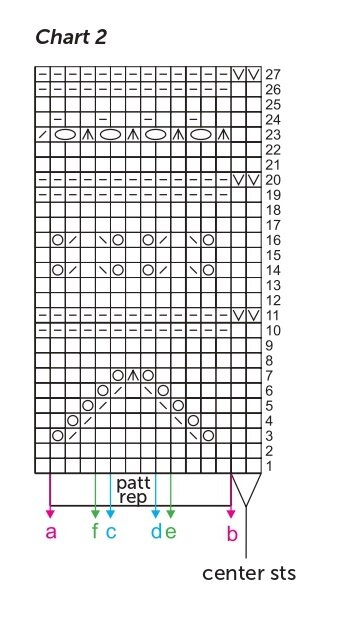 Рукава: перенесите отложенные 66/74/82 петель на спицы, по краю подреза поднимите и провяжите еще 12 п. = 78/86/94. Продолжайте провязывать 2 центральные петли рукава в каждом ряду. Отметьте маркером 6 и 7 петлю подреза, далее провязывайте их лицевыми петлями в каждом ряду. Продолжайте вязать по схеме 2 следующим образом: между 2-й петлей у подреза и 2-мя центральными петлями рукава повторите раппорт узора 3 раза, закончите петлей после раппорта / начните с 4 п. после стрелочки «с», повторите раппорт 3 раза, закончите петлей после раппорта / начните с 8 п. после стрелочки «е», повторите раппорт 3 раза, закончите петлей после раппорта. Между 2-мя центральными петлями рукава и 1-й петлей у подреза повторите раппорт узора 3 раза, закончите петлей после раппорта / повторите раппорт 3 раза, закончите 4-мя петлями перед стрелочкой «d» и петлей после раппорта / повторите раппорт 3 раза, закончите 8-ю петлю перед стрелочкой «f» и петлей после раппорта. Центральные 2 петли рукава снимайте по схеме в 11, 20 и 27 рядах. Далее в 12/12/10 ряду убавьте по 1 петле с обеих сторон от подреза. Повторите убавление в каждом 12-м ряду 11 раз / в каждом 12-м ряду 5 раз, затем в каждом 1-0м ряду 8 раз / в каждом 10-м ряду 3 раза, затем в каждом 8-м ряду 14 раз. На высоте 155/162/162 рядов длина рукава составит 43/45/45 см. Закройте все петли лицевыми. Перенесите отложенные петли второго рукава на спицы и вяжите аналогично первому.