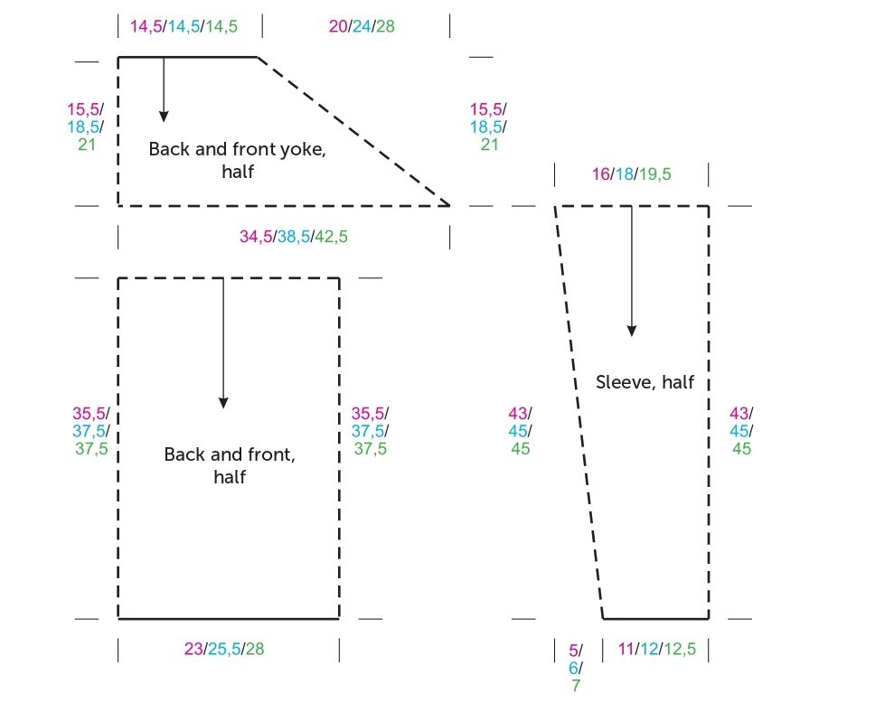 Кокетка: на спицы 3,5 мм наберите наберите 140 петель, отметьте маркером начало ряда, замкните вязание. Провяжите 1 ряд схемы, повторяя раппорт 4 раза. Продолжайте вязать узор по схеме до 57/67/76 ряда = 332/372/412 п. на спицах = 15,5/18,5/21 см от наборного края. Перенесите 66/74/82 петель для каждого рукава на дополнительные спицы = 33/37/41 петель каждый рукав.