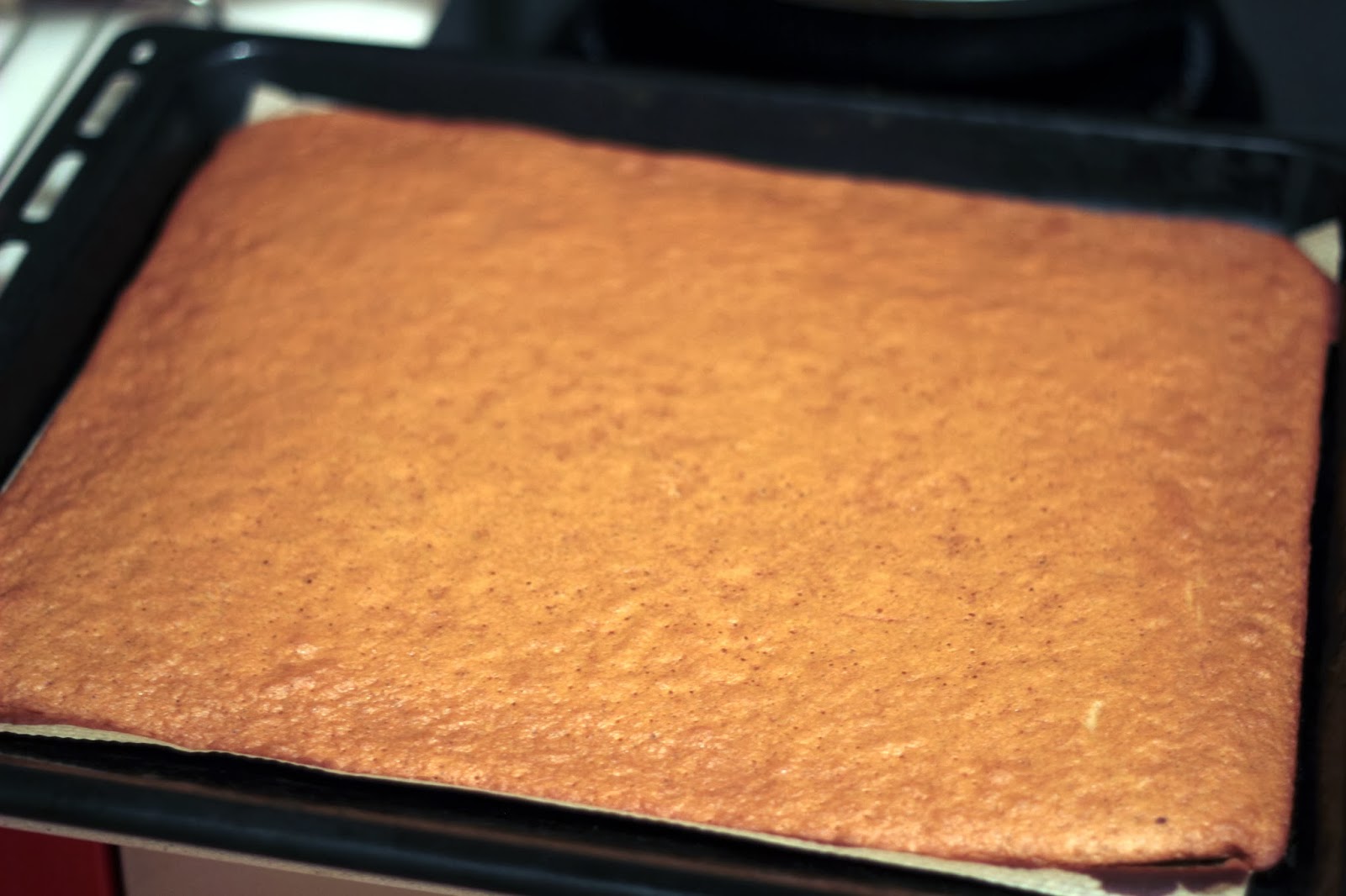 Вылить тесто на противень, застеленный бумагой для выпечки (мой противень размером 28*35 см), и разровнять лопаткой. Поставить в духовку на 9-10 минут.