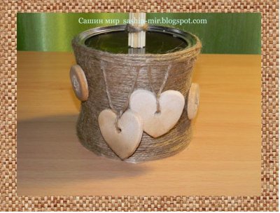 Крона готова и можно украсить горшочек. Из соленого теста выпекла сердечки и пуговицы. Сердечки решила подвесить на край горшочка, а пуговки "пришила" с разных сторон. Все крепила с помощью термопистолета.