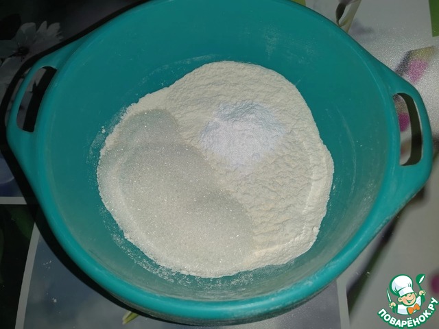 Просеять муку и разрыхлитель. Всыпать сахарный песок, соль и хорошо перемешать венчиком.