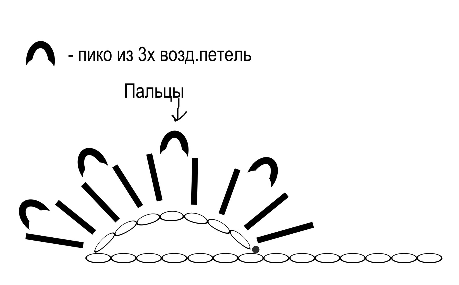 Сооружаем лапки Рачьим шагом провязываем 11 петель, (7 в.п., соед .столбиком закрепить цепочку в 6-ю петлю. Провязать на цепочке 9 стбн, и 4 пико из 3 в.п.(чтоб было понятнее - привожу рисунок)*).