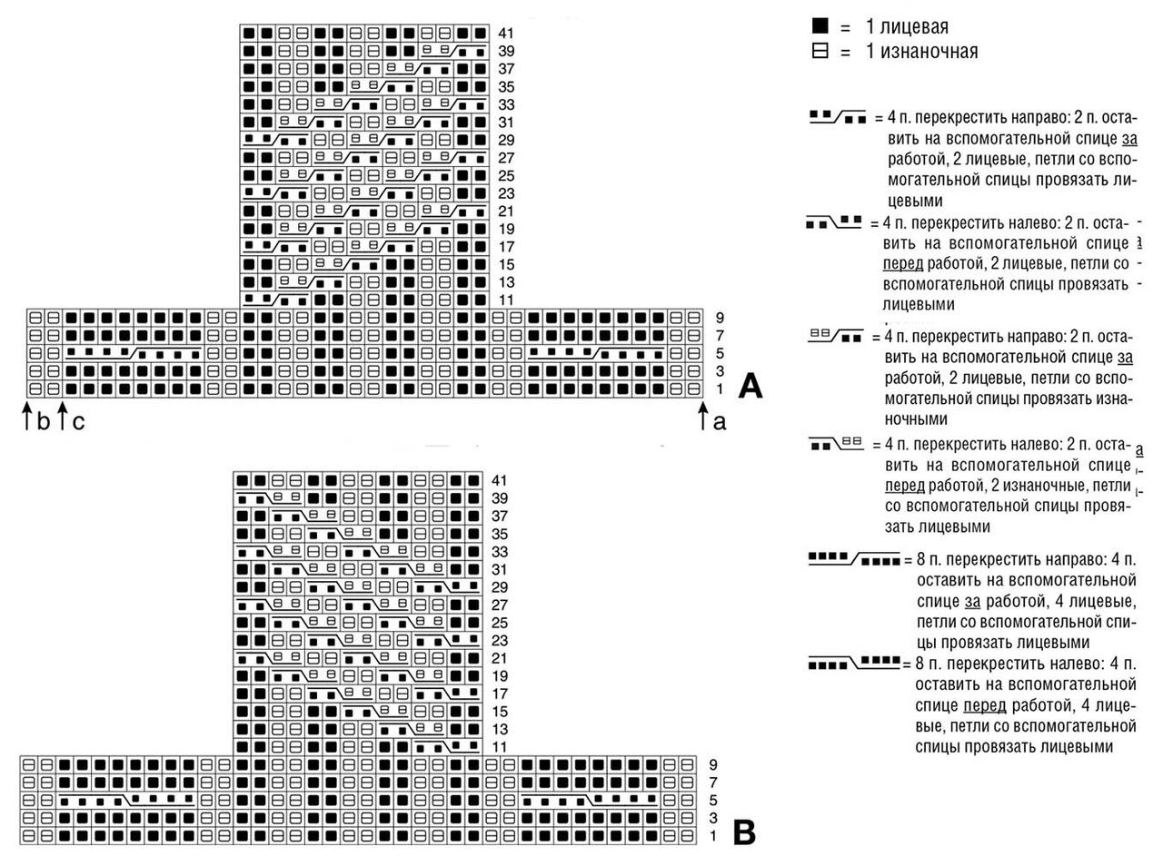 Вязать симметрично и узором с «косами» B. Для убавок выреза горловины провязывать по узору 2 п. вместе изн. или лиц. с наклоном влево: 1 п. снять, как лиц., след. петлю провязать лиц. и протянуть через неe снятую петлю.