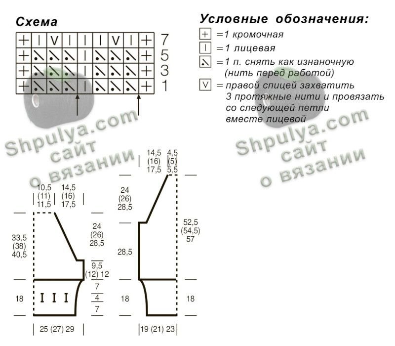 Узор 3. Узор со снятыми петлями (число петель кратно 4 + 3 + 2 кромочные). Вязать по схеме. На ней даны только лицевые ряды; в изнаночных рядах все петли провязывать изнаночными. Начать с петли перед правой стрелкой, повторять раппорт из 4 п. и закончить петлями после левой стрелки. Выполнить 1 раз 1-8-й р.